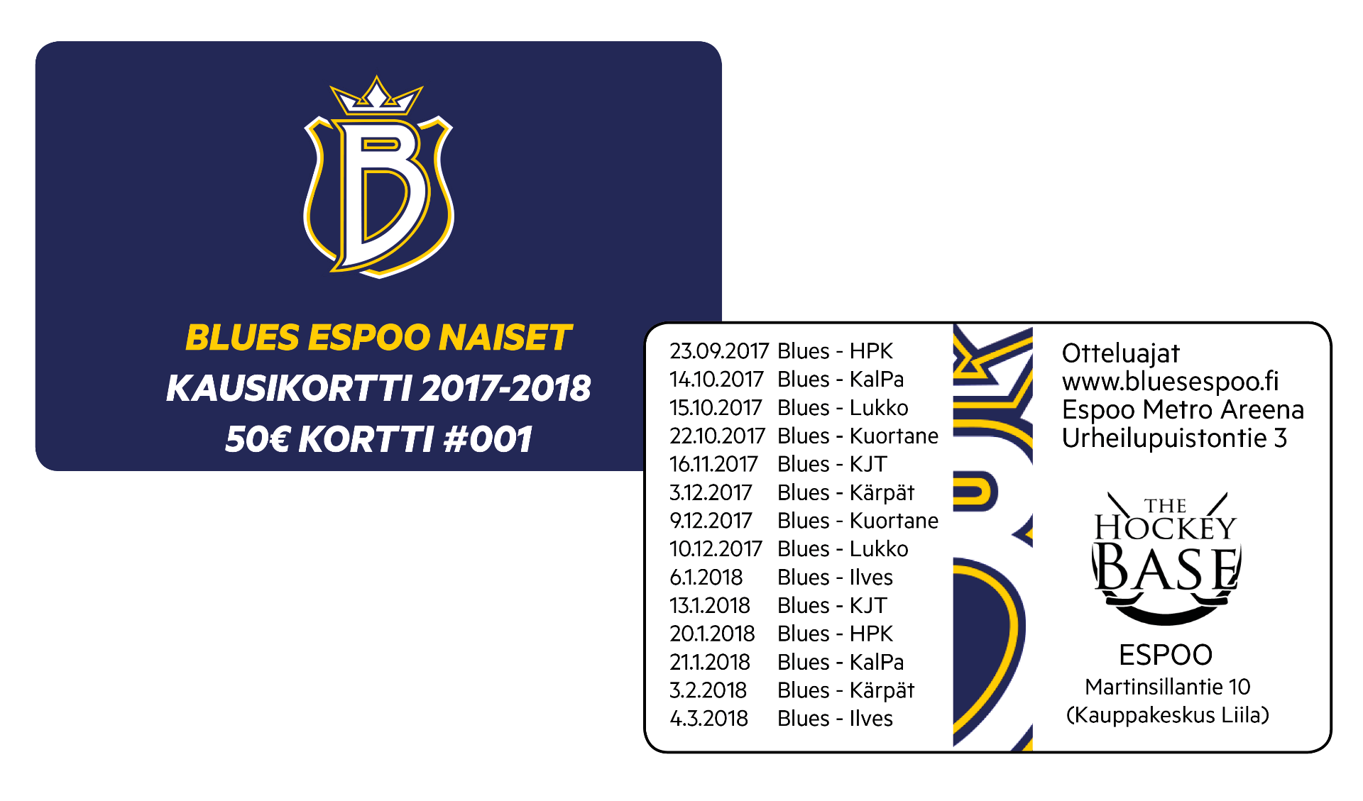 Tilaukset, kysymykset ja lisätiedot espooblues.naiset@gmail.com. Tilatessasi laitathan viestiin nimen, osoitteen, puhelinnumeron sekä sen, haluatko kortit postitettuna vai varattuna pelin yhteydessä.